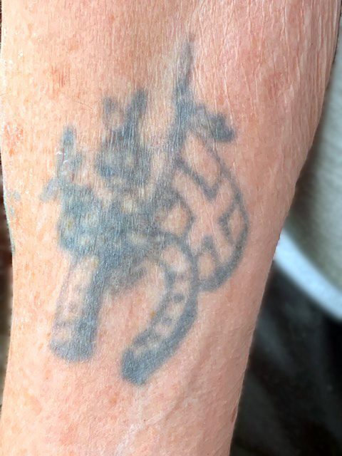 Hästsko omgärdad av blommor, blad och flagga. (Troligtvis Tato-Jim, 1949). Den då unge ägaren träffade på en dansk tatuerare som drog omkring med en vagn och tatuerade. Sammanlagt gjordes tre tatueringar till priset av 10kr styck. Eftersom kontanter saknades fick betalningen kompletteras med en silverring.